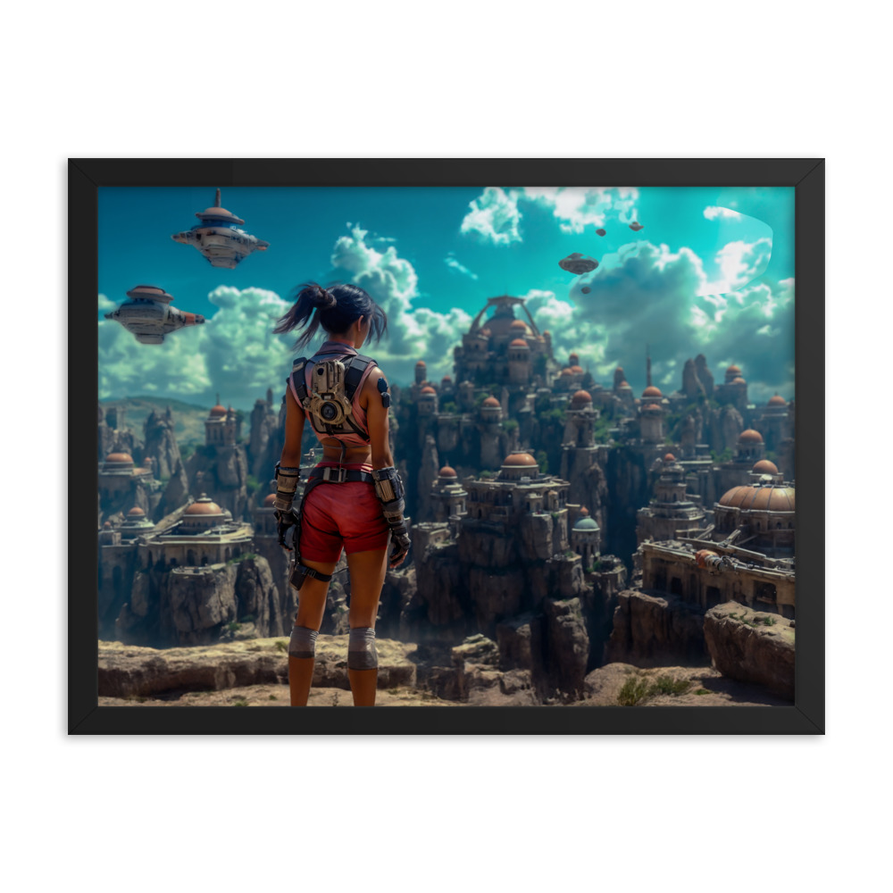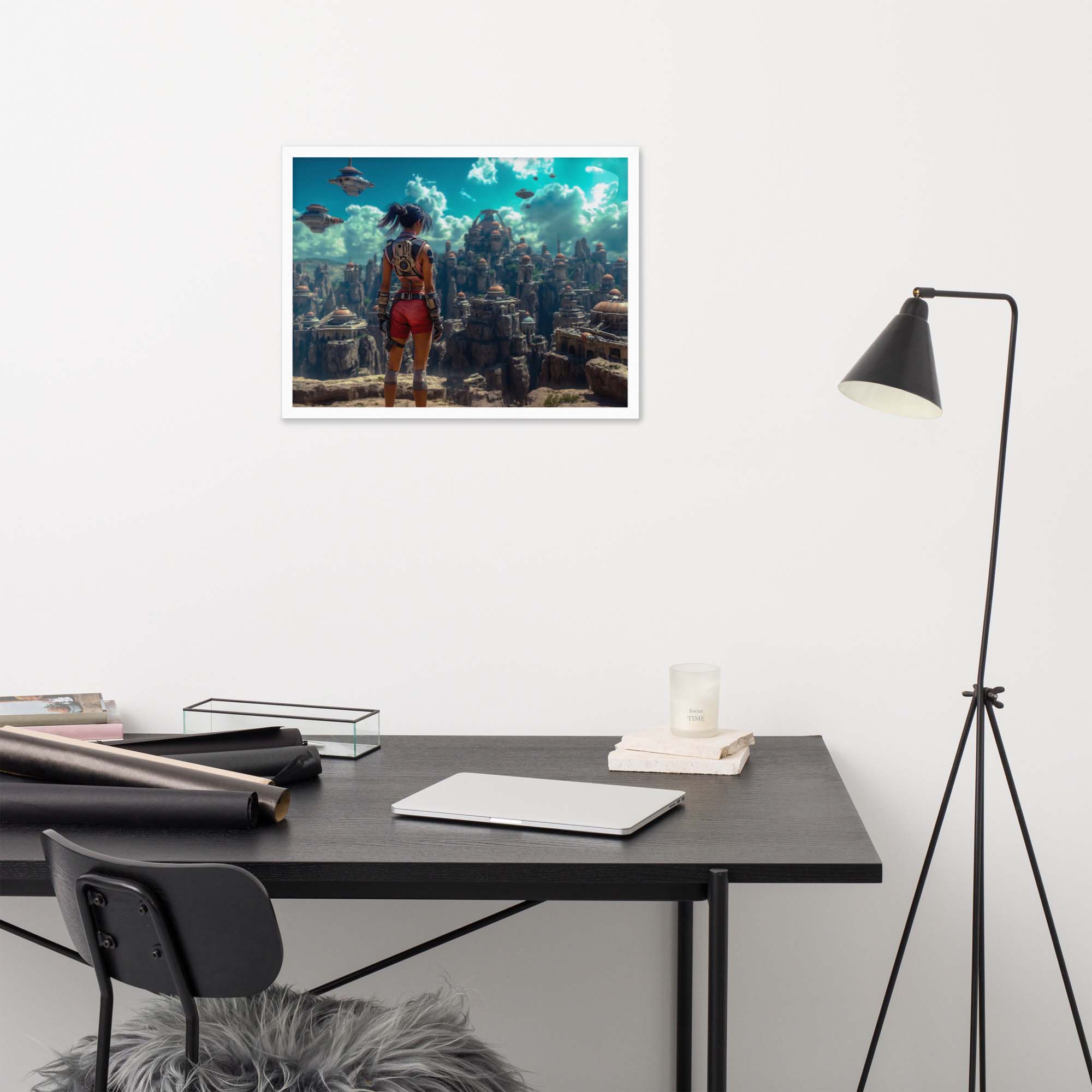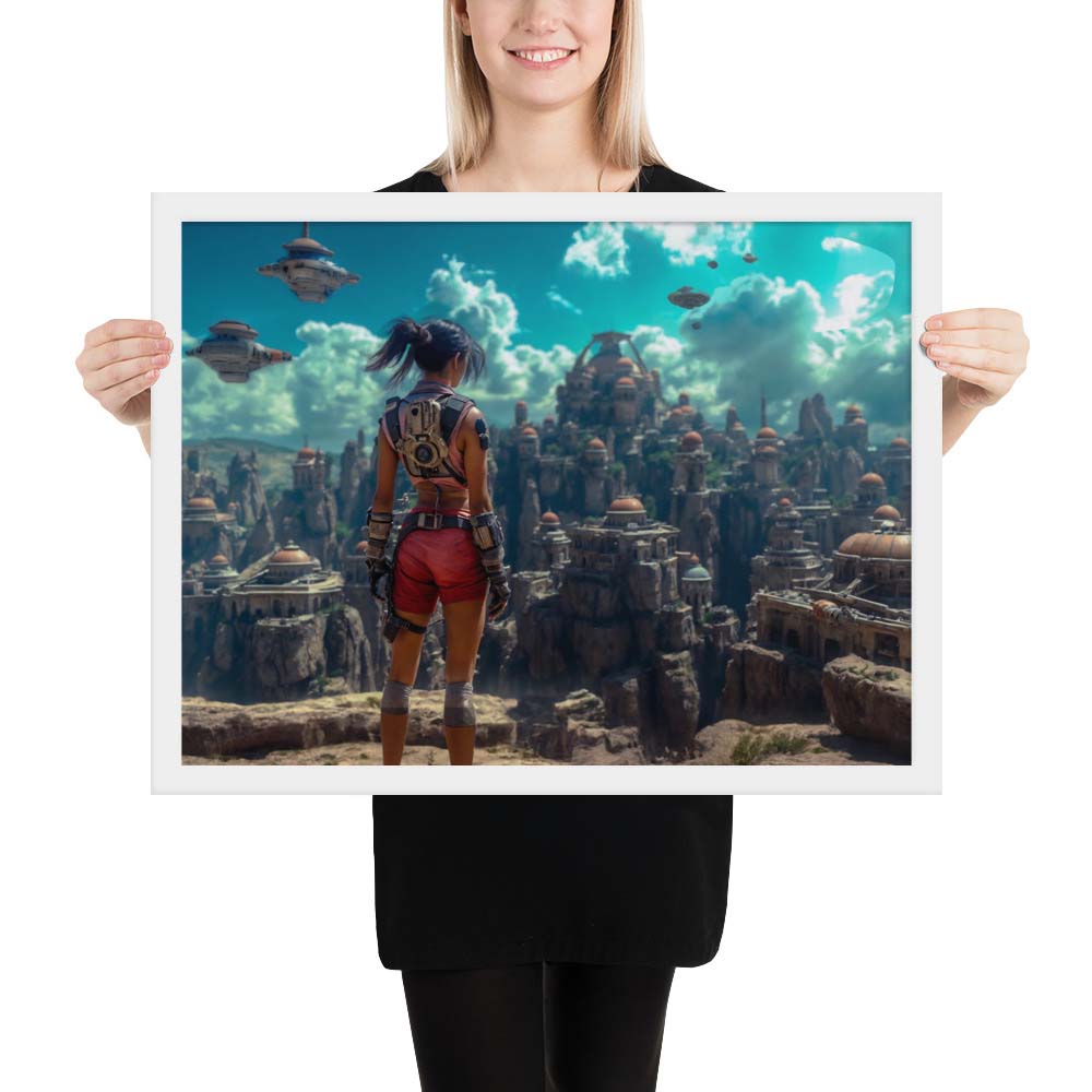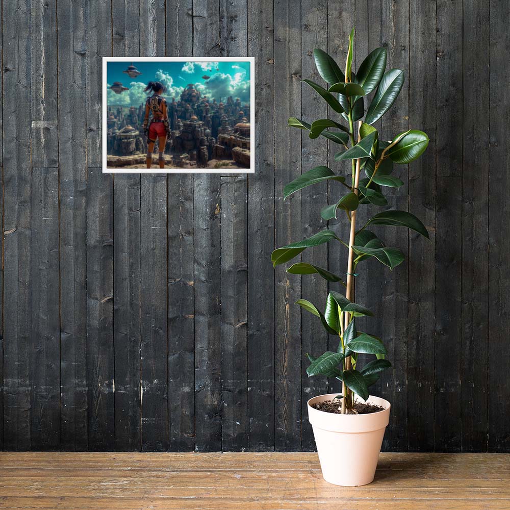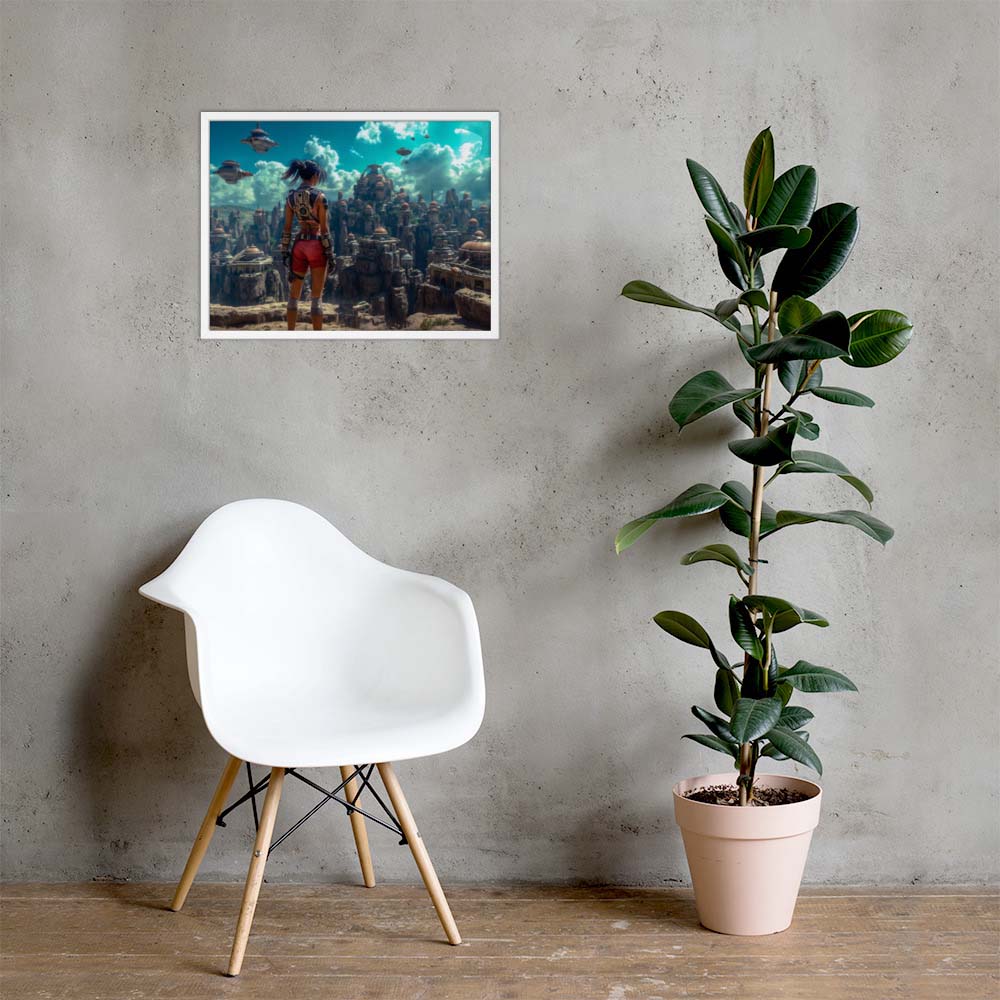 An original Framed Print of science fiction art by Chris Tome. Created with Midjourney, Flux, Mystic, Photoshop and a Wacom tablet, this one of a kind artwork invokes a sense of wonder and scale. Make a statement in any room with this custom created art. A combination of human and Ai, all Chris' art has a human touch in many ways, from extra painting to color correction, and more. Framed poster printed on high-quality paper, with a partly glossy, partly matte finish.