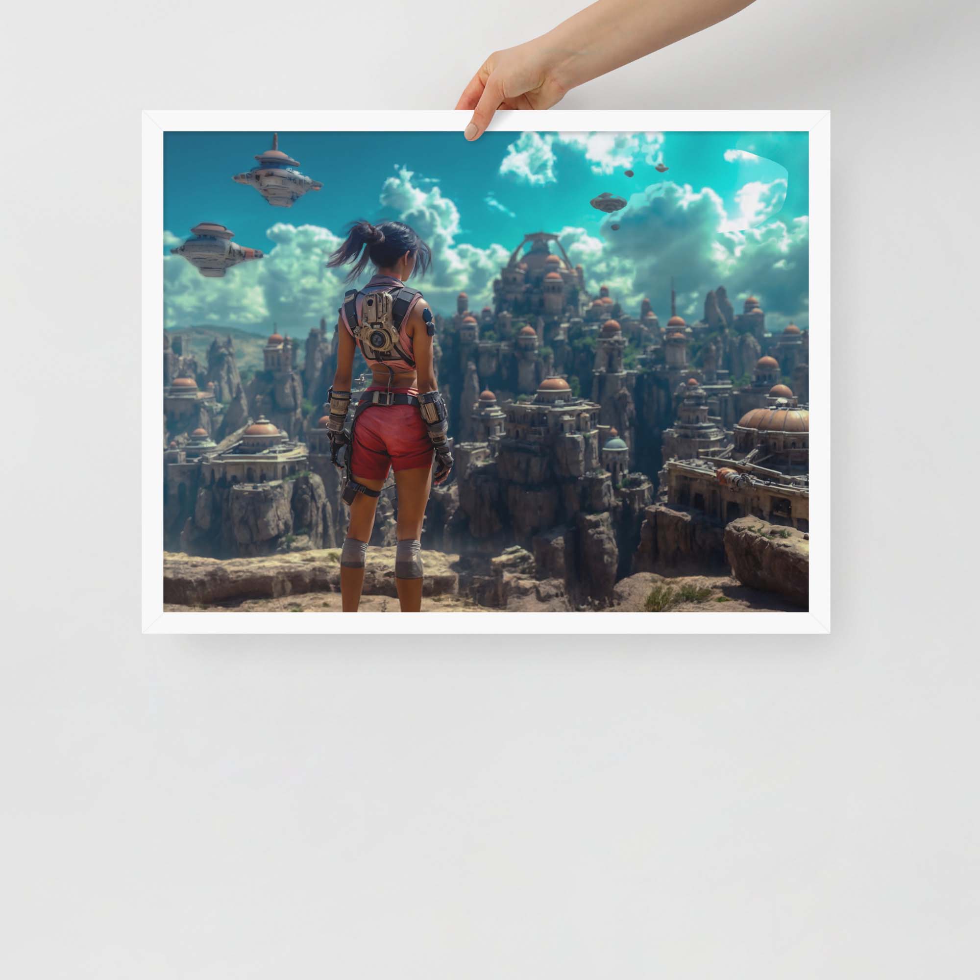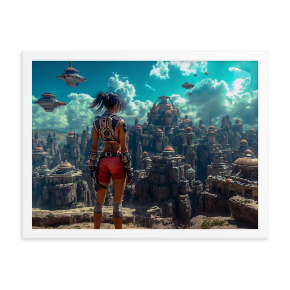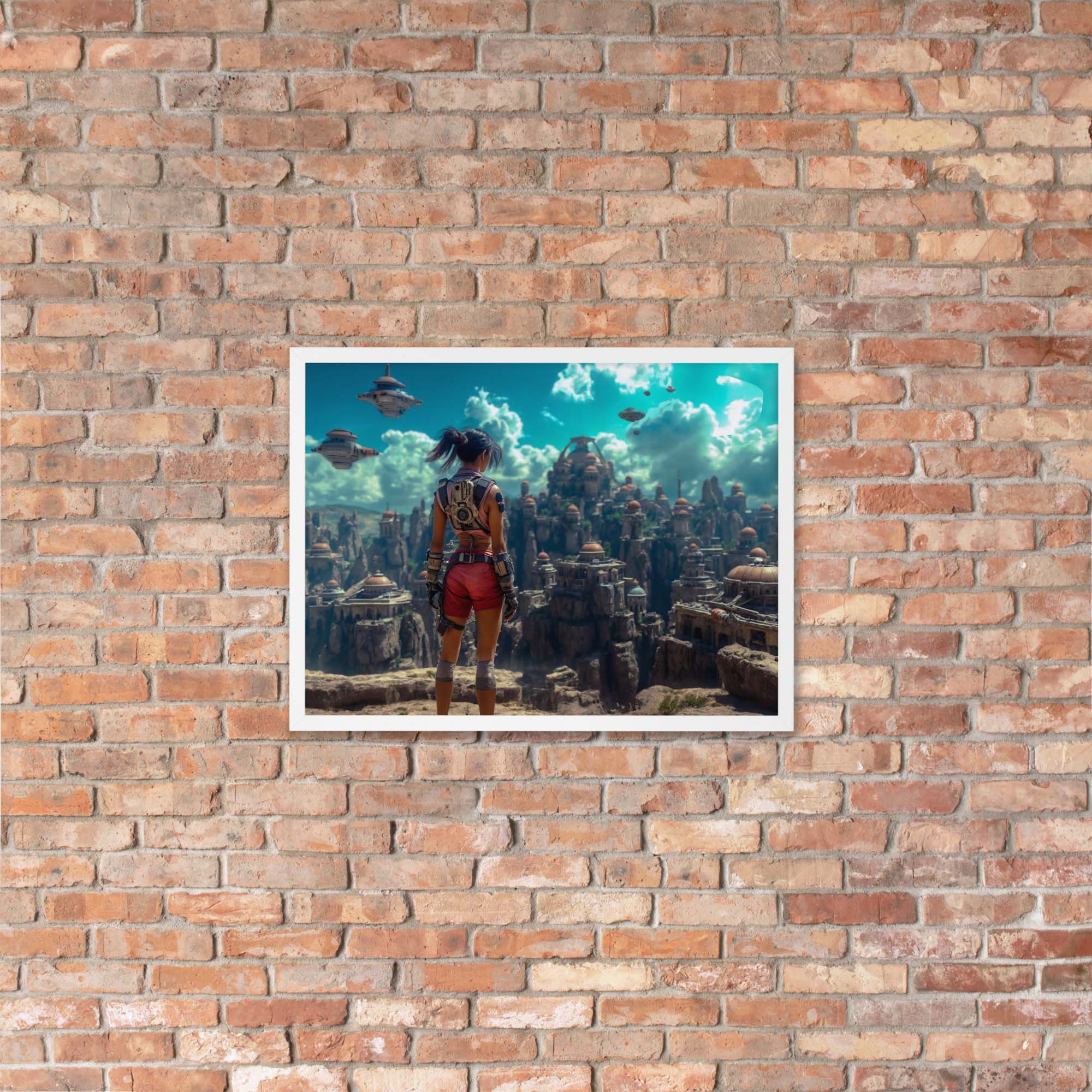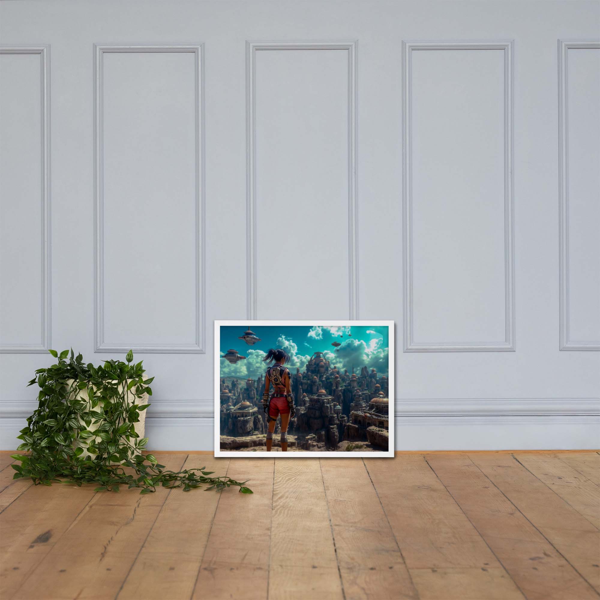 An original Framed Print of science fiction art by Chris Tome. Created with Midjourney, Flux, Mystic, Photoshop and a Wacom tablet, this one of a kind artwork invokes a sense of wonder and scale. Make a statement in any room with this custom created art. A combination of human and Ai, all Chris' art has a human touch in many ways, from extra painting to color correction, and more. Framed poster printed on high-quality paper, with a partly glossy, partly matte finish.